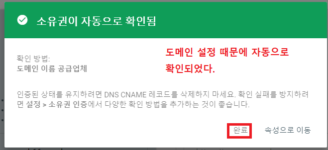 미리 블로그스팟 환경설정에서 도메인 설정을 해놓아서 그런지, 자동으로 확인되었다.