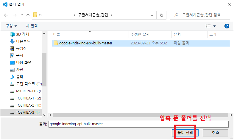 그리고 전에 압축을 푼 폴더를 선택하였다.