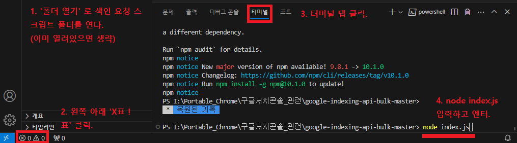 이렇게 설치 및 초기설정을 다 해두었으니, 앞으로는 'urls.txt' 에 색인 요청할 게시물 주소를 넣는 것과 'node index.js' 라는 명령어만 잘 기억하고 있으면 된다.