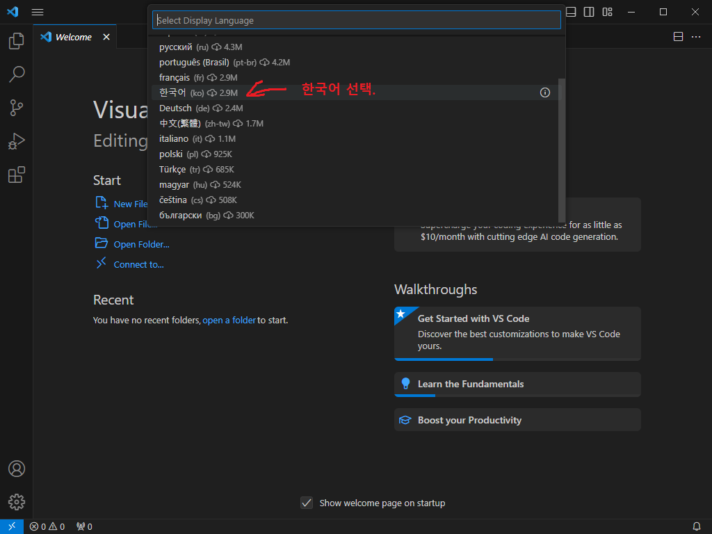 그런 다음 Visual Studio Code를 실행하니... 다 영어라서 혼란스럽기만 하다.