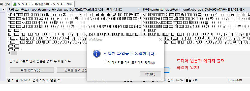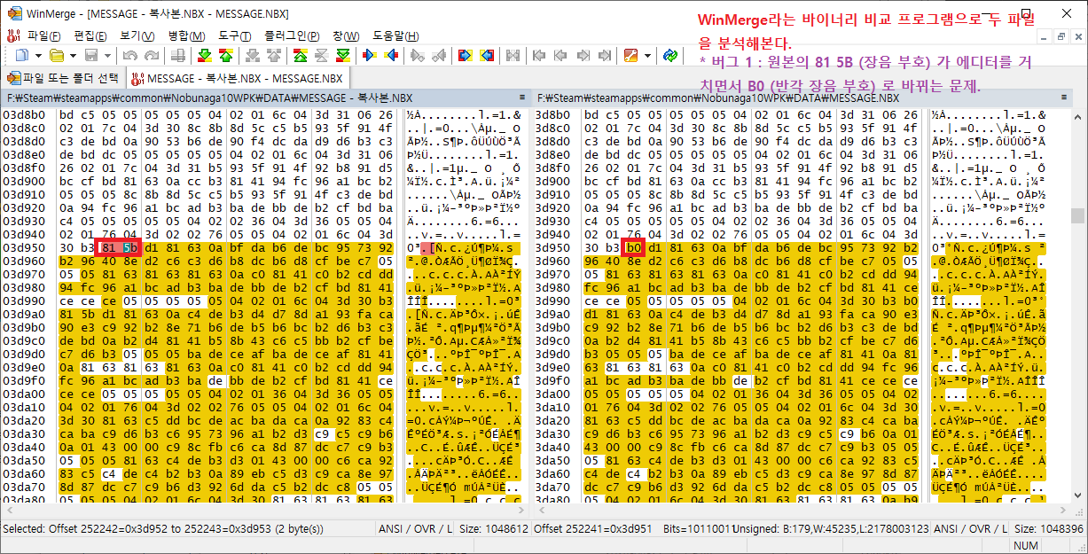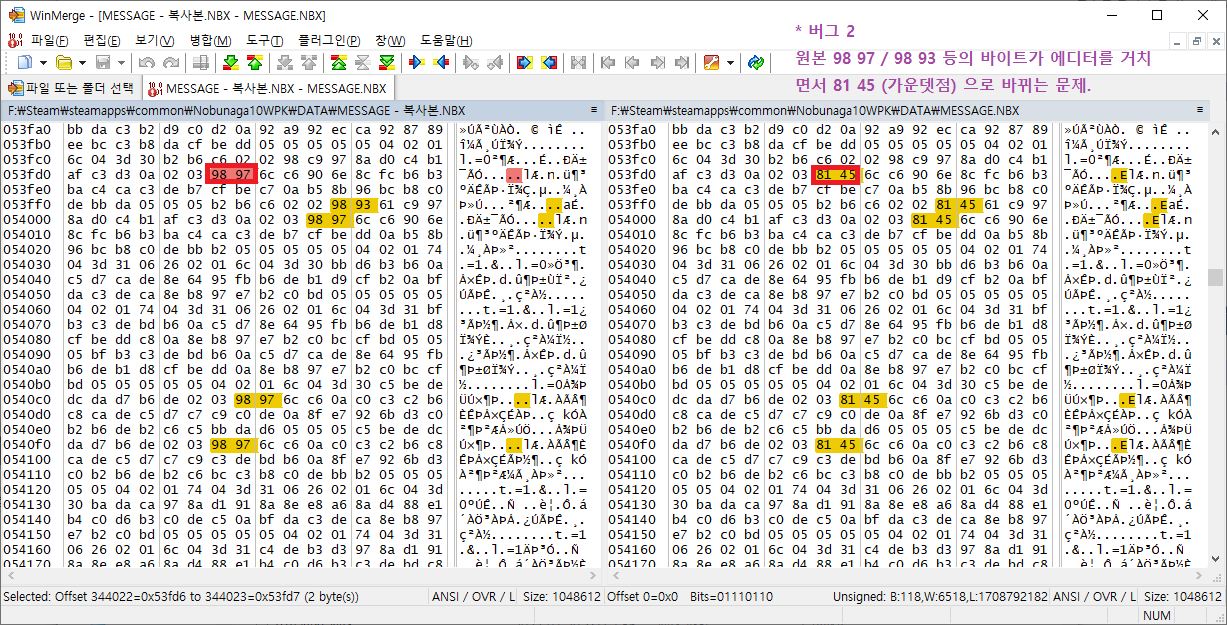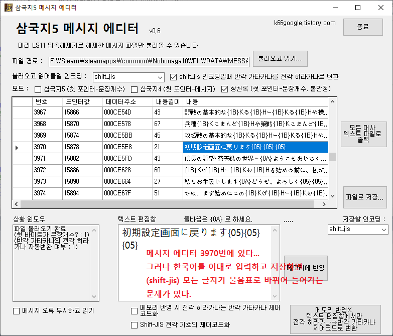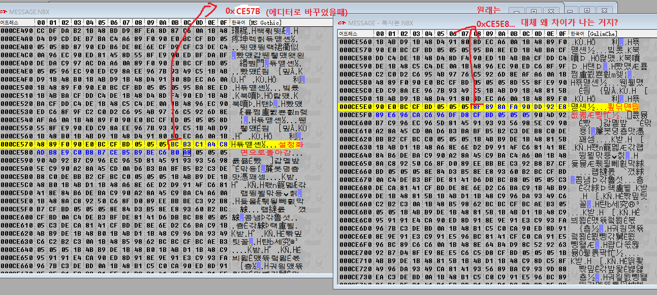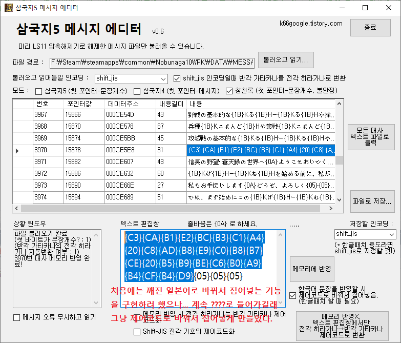 아래 스샷은 삼국지5 메시지 에디터를 공개 배포하기 전, 신장의 야망 창천록 메시지 파일 (message.nbx) 수정 지원을 위한 개조 과정을 찍어놓은 것입니다.