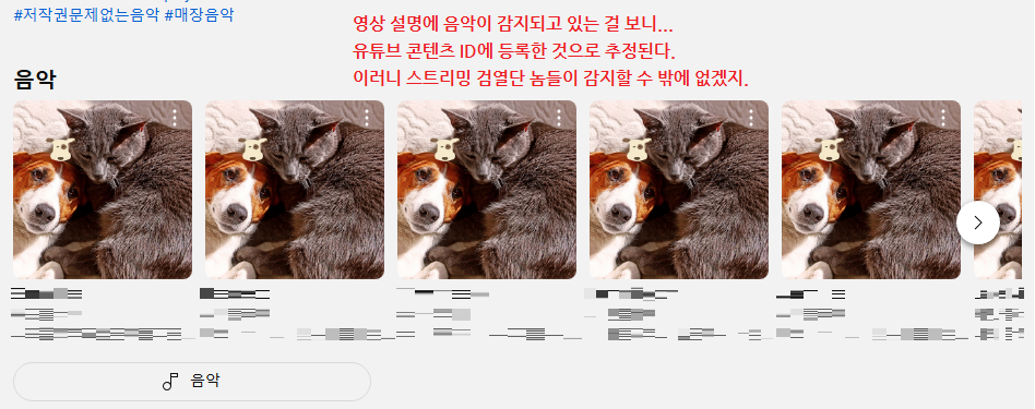 즉, 매장음악은 유튜브 콘텐츠 ID에 등록된 것으로 추정된다. 이러니까 검열단 놈들이 감지할 수 밖에 없겠지.