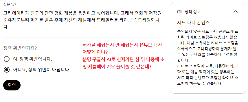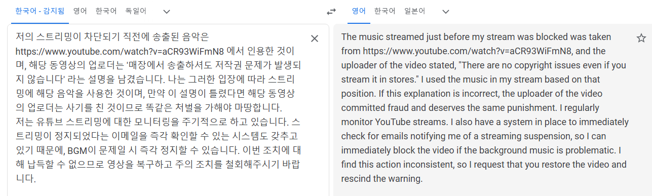 어떤 놈들이 이의제기를 처리할지 모르겠지만, 내가 보기엔 유튜브 본사의 어중이떠중이들이 보는 것 같으니 영어로 번역해서 보내야 그놈들이 조금이라도 읽어보지 않겠나라는 생각이 든다. 한국어로 보내면 읽지도 않고 기각 때릴지도 모르니.