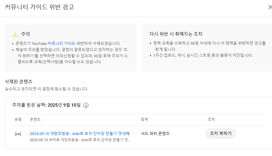이후 도착한 메일을 확인한 결과, 죄목은 '서드 파티 콘텐츠' 이며 이로 인해 내 채널은 억울하게도 '주의' 딱지가 붙게 되었다.