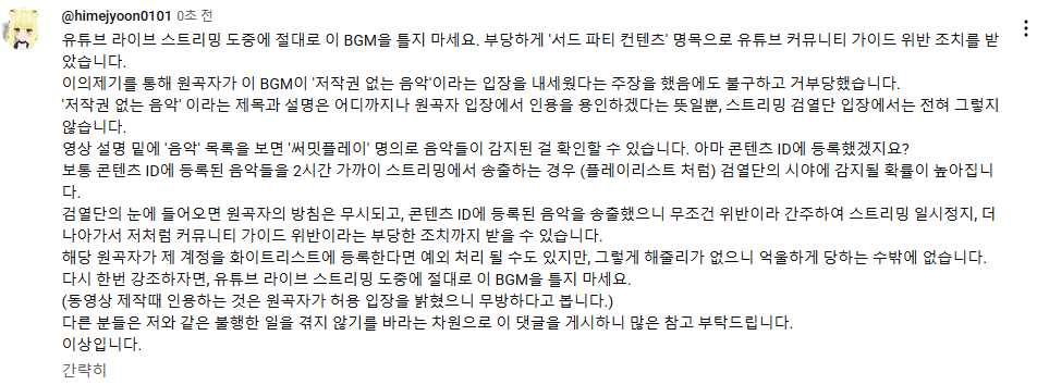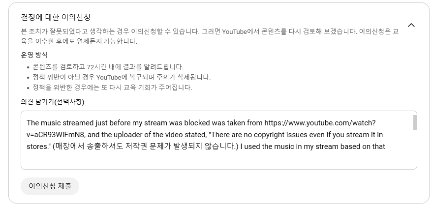 스트리밍 차단 당시에 연주된 음악은 원곡자가 '매장에서 송출해도 저작권 문제가 발생되지 않는다.' 라는 문구를 기재했기에 사용한 것이다. 그게 거짓이면 원곡자가 사기를 친 거니 똑같이 처벌해야 마땅하다. 나는 유튜브 쪽에서 온 메일을 즉각 확인할 수 있는 시스템을 갖추고 있으니 BGM이 문제일 시 즉각 정지시킬 수 있다. (모니터링을 게을리 하지 않았다는 의미) 이 조치에 대해 납득할 수 없으니 영상을 복구하고 주의 조치를 철회해달라.