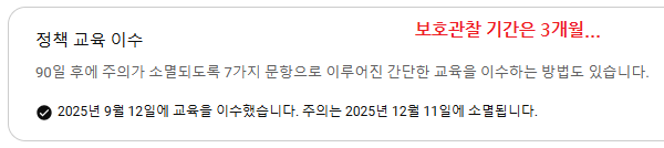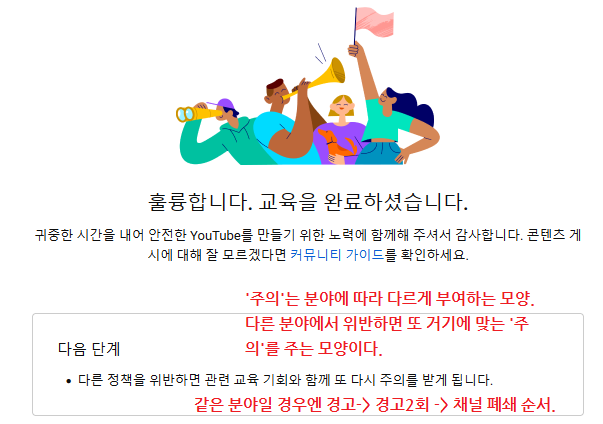 남은 건 90일간의 보호관찰 기간이다. 이 기간동안 같은 분야에서 징계만 안 먹으면 '주의' 딱지가 사라지고 채널은 깨끗한 시절로 돌아간다. 하지만 동일한 분야에서 또 징계를 먹으면 '경고 → 경고 2회 → 채널 폐쇄' 순서로 이어진다.