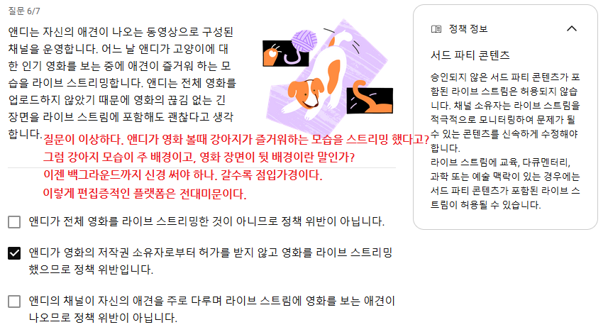 일단 나는 앤디가 '고양이에 대한 인기 영화를 보며 즐거워하는 애견의 모습을' 라이브 스트리밍 했다. 라고 해석했다.