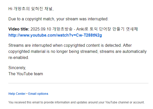 나는 그런 사태를 대비하기 위해 유튜브 쪽에서 메일이 올 경우 바로 윈도우 알림 영역에 뜨도록 관련 프로그램을 설치하고 설정해두었다. 이럴때는 BGM을 끄고 몇 분 내버려두면 풀린다.