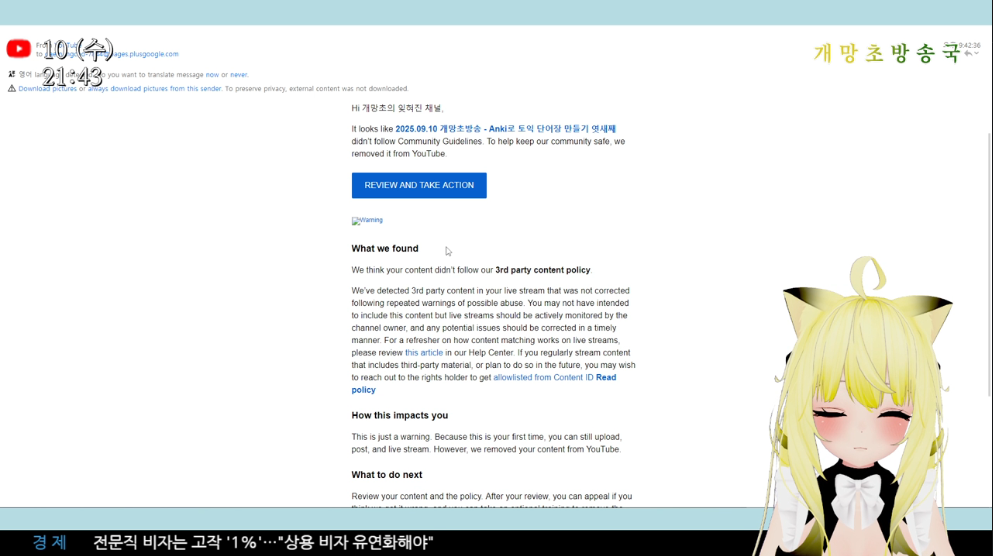9월 10일 스트리밍 당시 경고가 한 번 날아온 적은 있다. 하지만 그건 바로 시정되었다.