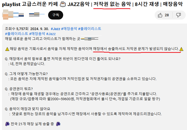 제목과 설명에 '저작권 없는 음악' / '매장에서 송출해도 저작권 문제가 발생되지 않는다' 라는 내용이 포함된 플레이리스트 영상 (이하 '매장음악') 을 찾게 되었다.